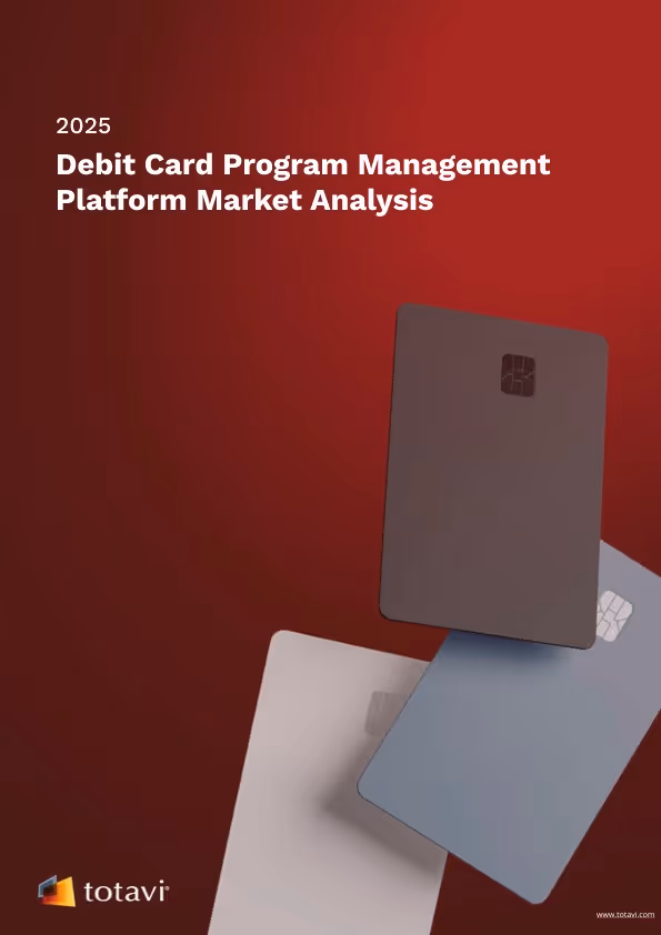 Totavi's debit card program management analysis evaluates nine platforms, including Alviere, Galileo, Highnote, Lithic, Marqeta, Qolo, Stripe, Synctera, and Unit. The report includes an extensive side-by-side comparison of program management capabilities, including: program setup, bank agreements, funding and money movement features, card features, origination and issuing features, compliance and security, and more.
